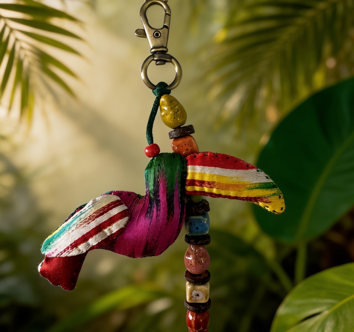 ! У него есть одна особенность: он абсолютно не умеет быть незаметным. Его клюв — главный герой: яркий, насыщенный, дерзкий! Сшитый вручную из винтажного узбекского хан-атласа, он словно собрал в себе солнце, фрукты и шум южных рынков. Керамические бусины — тоже ручная работа — добавляют тактильности и глубины: их хочется рассматривать, трогать, перебирать пальцами. Они не идеальны — и в этом их изюминка. Если сумка — это база, то тукан — это дерзкое «а теперь смотри сюда». Купить туканчика можно здесь