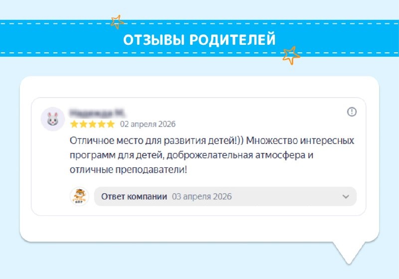 ! 🌟 Мы получили теплый отзыв о нашем филиале на ул. Искры и он нас очень тронул! Каждый такой отзыв — для нас большая награда. Мы искренне рады, что наши курсы дополнительного образования детей и занятия для детей приносят пользу и радость! 📢 Друзья! Если вам тоже есть что сказать о нашем центре — будем очень благодарны за ваш отзыв на Яндекс.Картах. 👉 Оставить отзыв Спасибо, что вы с нами ❤️ ____ Плохо грузит Telegram? Читайте в MAX ВКонтакте