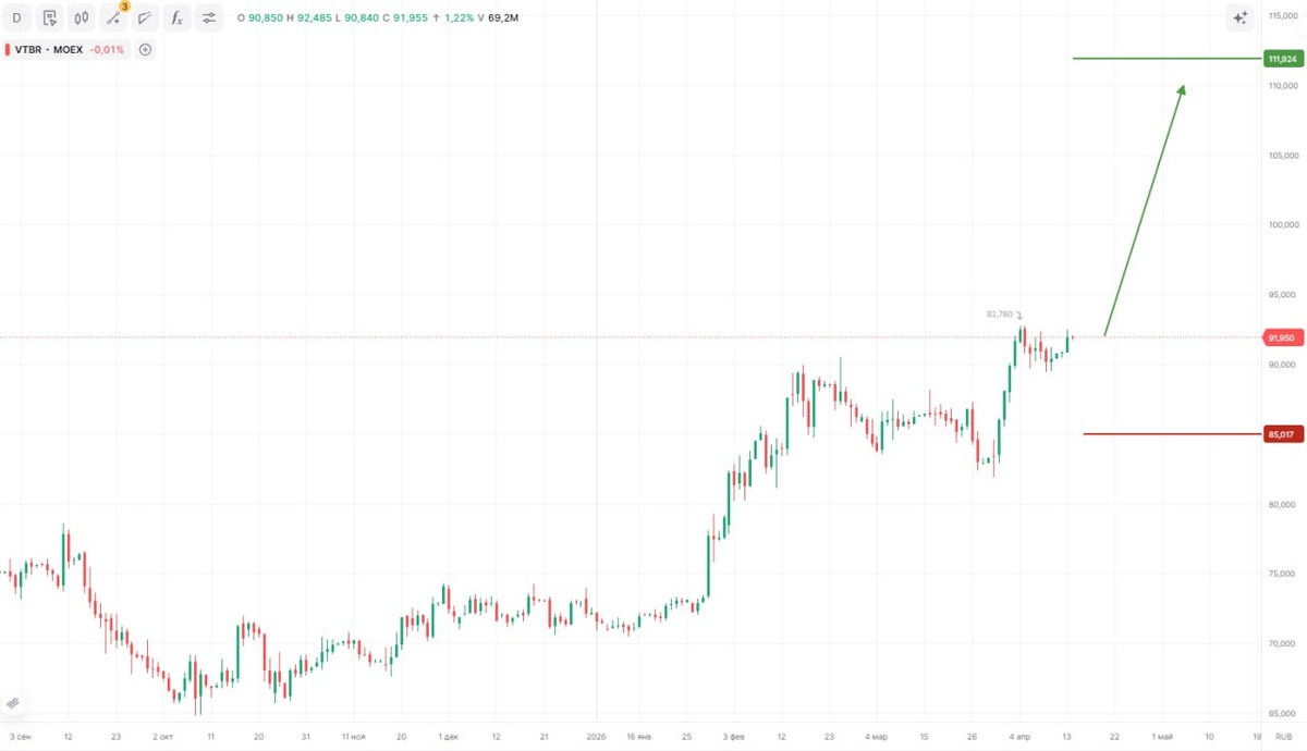 » Тикер: #VTBR Идея: Long ⬅️ Срок идеи: 1 месяц Цель: 111,81 руб. Потенциал идеи: 21,66% Объем входа: 6% Стоп-приказ: 82,31 руб. 🧳 Технический анализ Акции демонстрируют относительную силу на фоне общего ослабления рынка, что указывает на устойчивый интерес покупателей. Текущая консолидация под уровнем сопротивления повышает шанс на пробой ключевой отметки и продолжение движения вверх. При объеме позиции в 6% и выставлении стоп-заявки на уровне 82,31 руб., риск на портфель составит 0,63%. Соотношение прибыль/риск составляет 2,08. 🏦 Фундаментальный фактор #ВТБ — второй по величине банк России с широкой сетью обслуживания корпоративных и розничных клиентов. Рост прибыли и возобновление дивидендных выплат после длительной паузы повышают привлекательность бумаги для широкого круга инвесторов. Ожидаемое снижение ключевой ставки ЦБ поддержит кредитование и улучшит маржинальность банковского бизнеса в среднесрочной перспективе. 🤖 AI-скринер Проверьте инвестиционную идею по VTBR с помощь