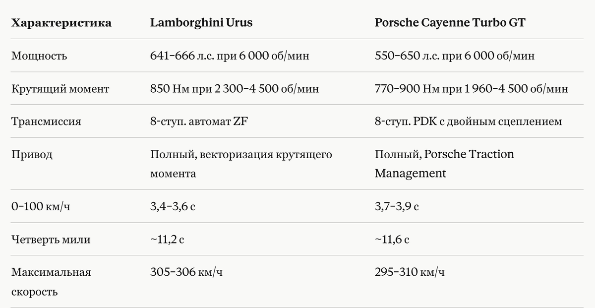 Lamborghini Urus и Porsche Cayenne Turbo делят одну платформу, один тип двигателя и одну ценовую категорию. На этом сходство заканчивается. Один создан, чтобы на него смотрели. Второй — чтобы на нём ездили каждый день и не уставать. Разбираем разницу на конкретных цифрах.