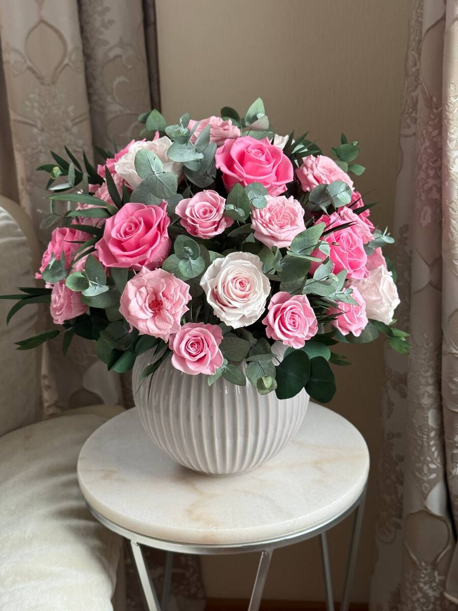 ⚜️Букет из стабилизированных роз «Pink Mondial» ⚜️Цена: 43300₽ (ваза входит в стоимость) ⚜️Размер: высота 36 см, диаметр 30 см. ⚜️Заказы принимаем на @Dostavkaroze или по телефону 89264344455