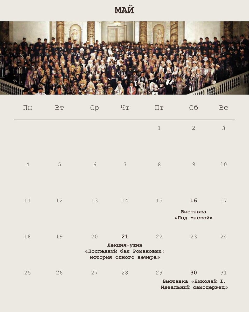Дорогие гости, приглашаем вас на мероприятия, которые стали частью спецпроекта «Романовы», посвященному юбилейным датам коронаций императоров Российской империи 16 мая 10:00 — Экскурсия по выставке «Под маской» в Музее русского импрессионизма 21 мая 19:00 — Лекция-ужин «Последний бал Романовых: история одного вечера» 30 мая 10:00 — Экскурсия по выставке «Николай I. Идеальный самодержец» в Историческом музее Открыли заранее, чтобы Вам было удобно спланировать свое время 🤍