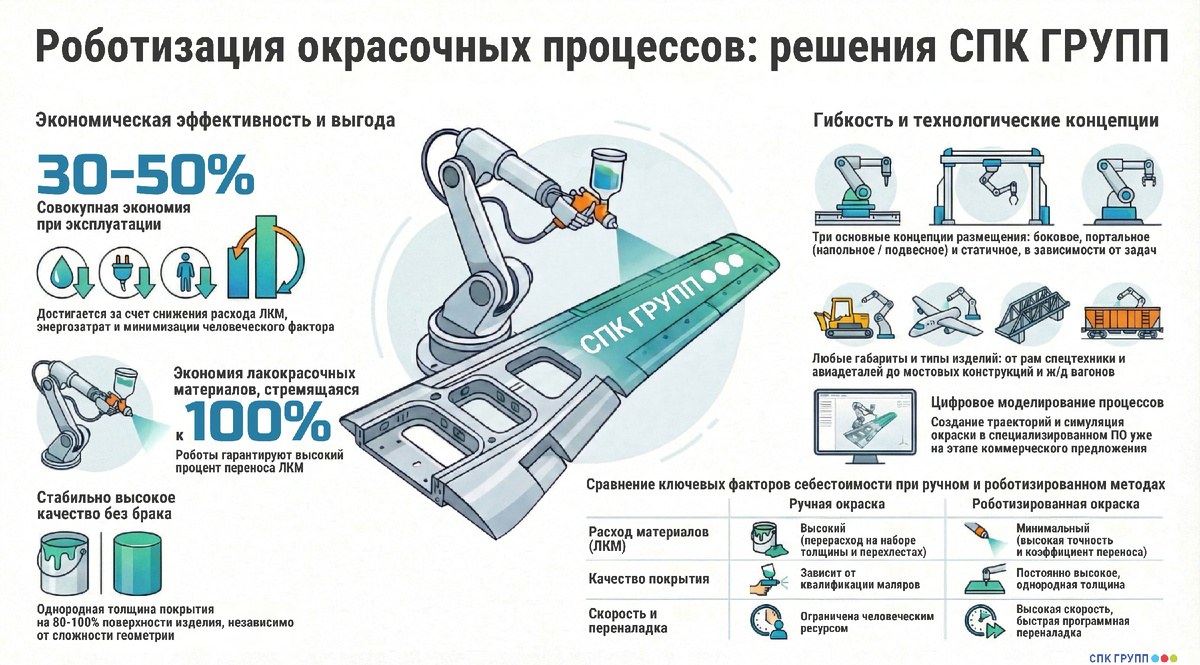 В современных условиях промышленного производства автоматизация перестает быть просто «трендом» и становится необходимым условием для конкурентоспособности предприятия. Одним из самых перспективных направлений является роботизация окрасочных цехов. Опираясь на решения компании группы компаний СПК | SPK GROUP, разберем, почему переход на роботов — это не только технологический прорыв, но и прямой путь к экономической выгоде. Внедрение роботизированных комплексов позволяет достичь от 30% до 50% совокупной экономии при эксплуатации. Эта цифра складывается из нескольких факторов: Снижение расхода ЛКМ: в отличие от человека, робот гарантирует высочайший коэффициент переноса материала, который стремится к 100%. Это минимизирует потери краски, улетающей «в воздух». Энергоэффективность: оптимизация рабочих циклов позволяет сократить затраты на электроэнергию. Минимизация человеческого фактора: робот не устает, не ошибается и не требует освещения или специфических условий комфорта, необходимых
