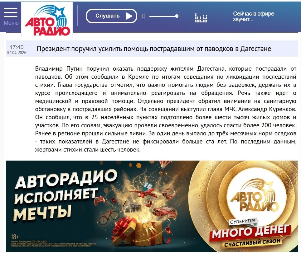 ускоренной национализации всего интернет-пространства, согласно которым соцсети, популярные сайты и поисковые сервисы должны будут размещать виджет с топ-5 новостей на главной странице, а аудиовизуальные площадки и классифайды должны буду размещать раздел топ-15 новостей. Наречь хотят это Национальной информационной платформой и повесткой управлять, согласно плану, будет непосредственно кто надо. Боня рассказывает о том, что творится в Дагестане, о чём молчат все СМИ; о новых пятнах в Анапе, которые отрицают все СМИ, об огромном количестве накопившихся проблем, создающих очаги напряжения - о том, что видит сама и о том, о чём ей сообщают люди. Ну, думаю, такая глобальная тема не могла бы обойтись без правильных социальных инициатив радиостанции, которой покупают самые большие рейтинги у секты свидетелей медиаскопа. Думаю - ну наверное есть в эфире какой-то спецпроект, который призывает людей на помощь, может, марафон какой-то... нет, на сайте жиденькие сообщения, будто дождик в огор