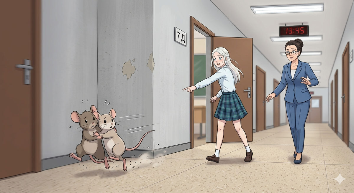 Сегодня я бегал по школьному коридору в поисках крошек и наткнулся на завуча и мальчика с мамой. Я резко затормозил и спрятался за шкаф.