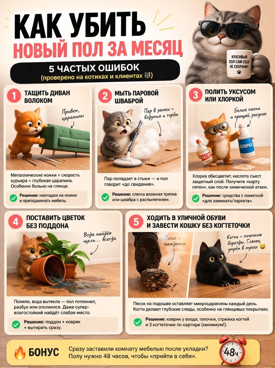 📉 Как испортить паркет за короткое время: распространённые ошибки