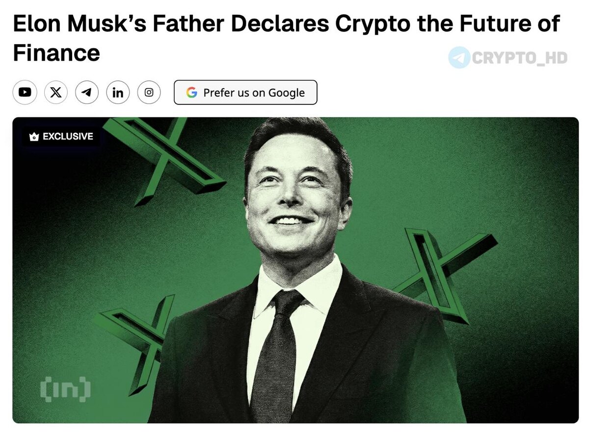 Отец Илона Маска заявил, что традиционная финансовая система «исчерпала себя», а криптовалюта неизбежно станет новой моделью управления деньгами. По его словам, перевести деньги через банки между странами «практически невозможно», тогда как в криптовалюте это делается мгновенно и без лишних барьеров. ❗️Но самое интересное – инсайд по семье: ⊹ Илон и Кимбал Маск, по его словам, владеют 23,400 BTC ($1,7b). ⊹ Однажды они получили платеж в Solana (#SOL) на сумму «чуть больше миллиона рублей», но «вышли на пике». Crypto Headlines