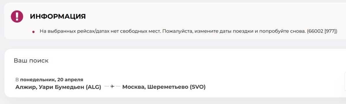 Подписчики интересуются, когда Air Algerie возобновит полеты в Москву. Крыша ТурДома убедилась, что авиакомпания продолжает отменять ближайшие вылеты по маршруту Алжир – Москва – Алжир. Пассажиры получают уведомления за несколько дней или даже накануне вылета. Но деньги возвращают оперативно – одна из туристок рассказала, что они поступили в день обращения. В расписании Шереметьево ближайшие вылеты в Алжир заявлены на 17 и 20 апреля, но на официальном сайте перевозчика билеты в Россию на эти даты недоступны – система выдает сообщение об отсутствии мест. Продажа на рейсы в Москву не ведется и на все апрельские и майские даты. Причину корректировок авиакомпания по-прежнему не называет. Подробнее написали на ТурДоме. @tourdom