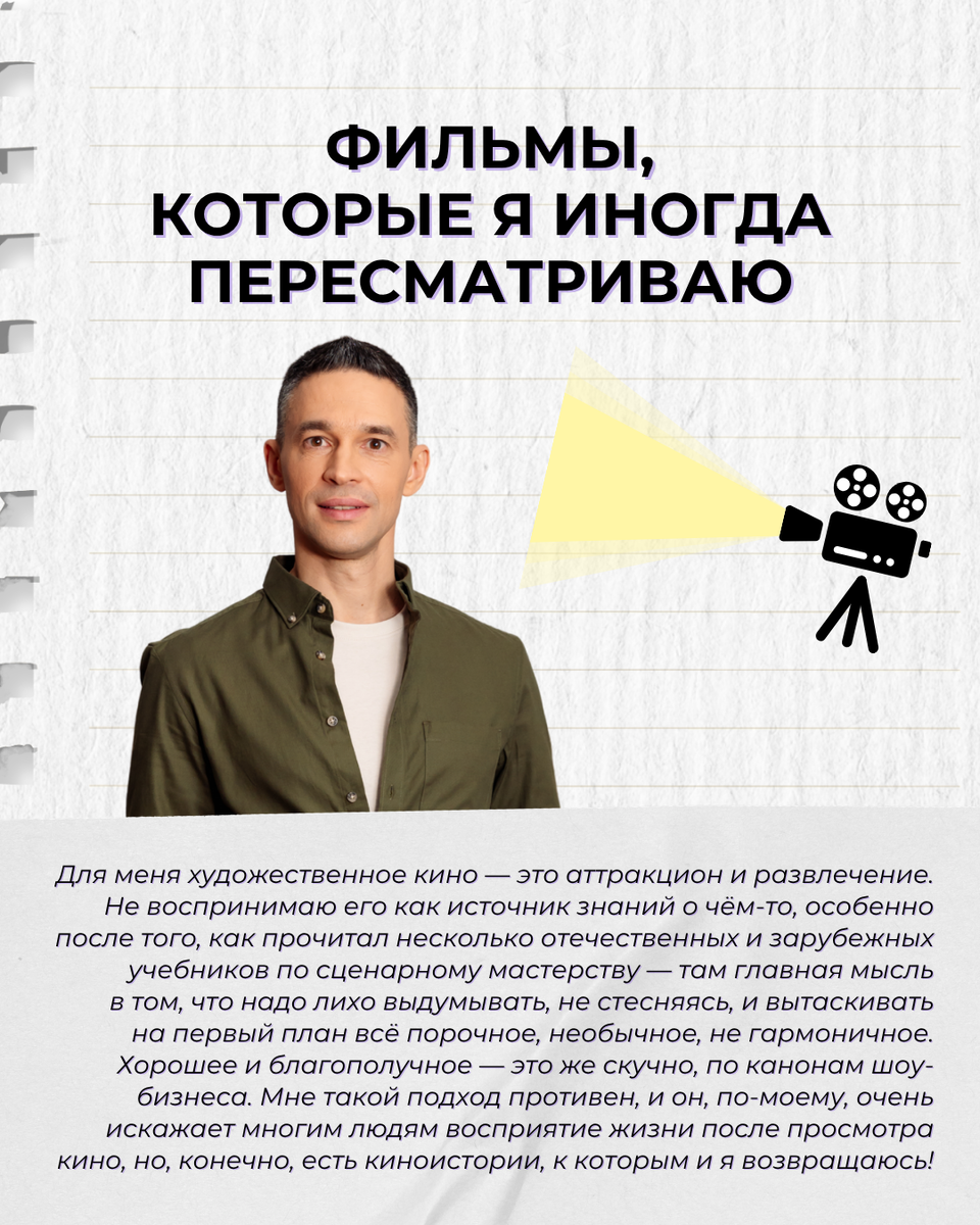 Я не очень люблю художественное кино — не фанатею от него и не ищу в нём глубоких смыслов. После того, как прочитал несколько учебников по сценарному мастерству (российских и зарубежных), стало понятнее, как оно устроено. По сути, это аттракцион: развлечение, в котором важно не столько отражение реальности, сколько её убедительное подобие. Во всех учебниках об этом прямо говорится: главное — удержать внимание зрителя. И ради этого в ход идут самые разные приёмы! Поэтому, как и в литературе, больше склоняюсь к нон-фикшн (то есть к документальному кино). Но при этом я, конечно, очень уважаю мастерство тех, кто это делает. И у меня есть 3 любимчика — рассказал о них в карточках! А у вас есть фильмы или сериалы, которые вы пересматриваете снова и снова? Как вам моё расследование? Если нравится, то поставьте «Палец вверх» и подпишитесь на мой канал. Будьте здоровы!