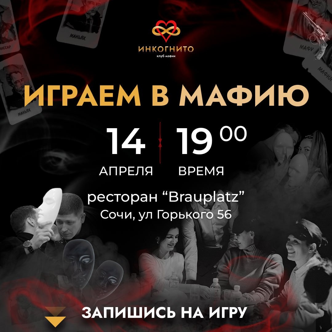 🕵️♂️ Хватит залипать в телефон — пора общаться вживую! 📆 Вторник 14 апреля ⏰ Сбор в 19:00 (для новичков), играем с 19:30 до 23:00 📍 Сочи, ул. Горького 56, ресторан “Brauplatz” 💸 Вход —1000₽ (вместо 1500₽) — за вечер с драйвом и новыми знакомствами ⚠️ Места ограничены — пиши 👉 @incognitoadmn Клуб интеллектуальных игр "Инкогнито" Сочи
