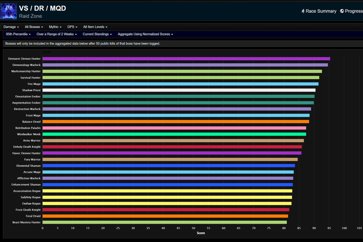 Сегодня мы изучаем рейтинги DPS за неделю от 13 апреля в дополнении Midnight, 1 сезон. Для данного анализа мы будем использовать данные, предоставленные Warcraft Logs. В то время как Охотник на демонов «Пожиратель», Охотник «Выживание» и Чернокнижник «Демонология» продолжают доминировать на верхних строчках по урону в рейдах, Охотник «Стрельба» также демонстрирует рост. В плане урона по боссам гонка трех лидеров продолжается, однако на этой неделе Разбойник «Ликвидация» вырвался вперед при рассмотрении всех процентилей. Общий урон Урон по боссам Общий урон Урон по боссам Для получения дополнительной информации о классах и специализациях в Midnight, ознакомьтесь с нашими классовыми гайдами ниже! Рыцарь смерти «Кровь» Рыцарь смерти «Лед» Рыцарь смерти «Нечестивость» Охотник на демонов «Пожиратель» Охотник на демонов «Истребление» Охотник на демонов «Месть» Друид «Баланс» Друид «Сила зверя» Друид «Страж» Друид «Исцеление» Пробудитель «Насыщатель» Пробудитель «Опустошение» Пробудитель «Хра