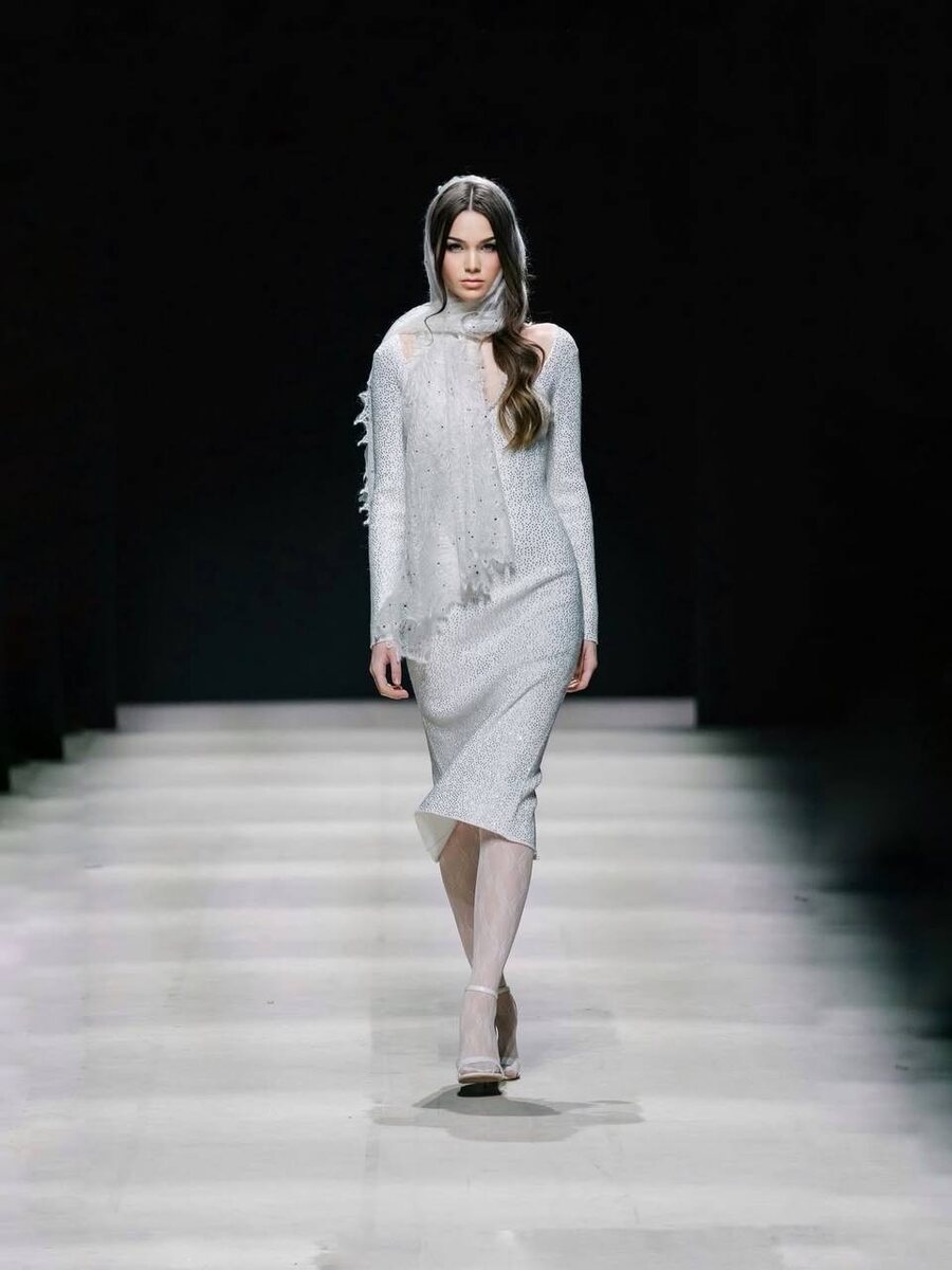 🤍 Утончённый, женственный силуэт. Облегающее миди-платье точно повторяет линии тела, подчёркивая фигуру. Платок из пухового кружева добавляет ему воздуха и мягкости. Полупрозрачные колготки и минималистичные каблуки сохраняют ощущение лёгкости- так образ выглядит естественно, но при этом собранно и продуманно.
