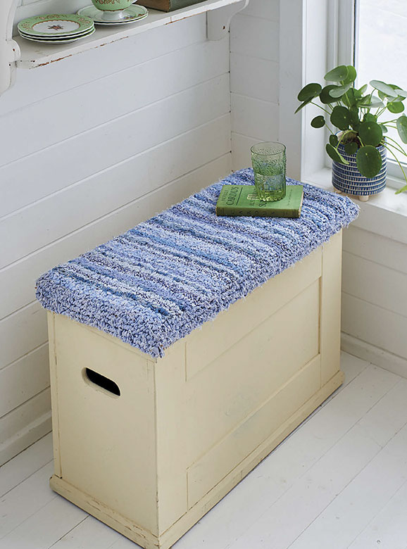 Все наши статьи про лоскутное шитье здесь. Дорогие друзья! Иногда самый обычный предмет мебели может превратиться в настоящую изюминку интерьера. Мы нашли старый сосновый сундук для хранения пледов на блошином рынке и решили дать ему вторую жизнь. Добавили мягкую сидушку в петельной технике — и теперь сундук стал многофункциональным: внутри можно прятать вещи, а сверху удобно сидеть. Особенно хорошо такое решение смотрится в узком коридоре, прихожей или у окна. Работа выполнена в петельной технике, поэтому поверхность получается ровной, аккуратной и приятной на ощупь. Синие оттенки разных глубин создают спокойный, но очень живой эффект. 1. Измерьте длину и ширину верхней крышки сундука. Отнимите по 5 см от каждого размера и вырежьте поролон точно по этим меркам. Лучше делать это аккуратно хлебным ножом. У нас крышка была 70 × 30 см, поэтому поролон получился 65 × 25 см. Немного скруглите углы поролона, чтобы они не были острыми. 2. Положите поролон на мешковину и обведите его маркером.
