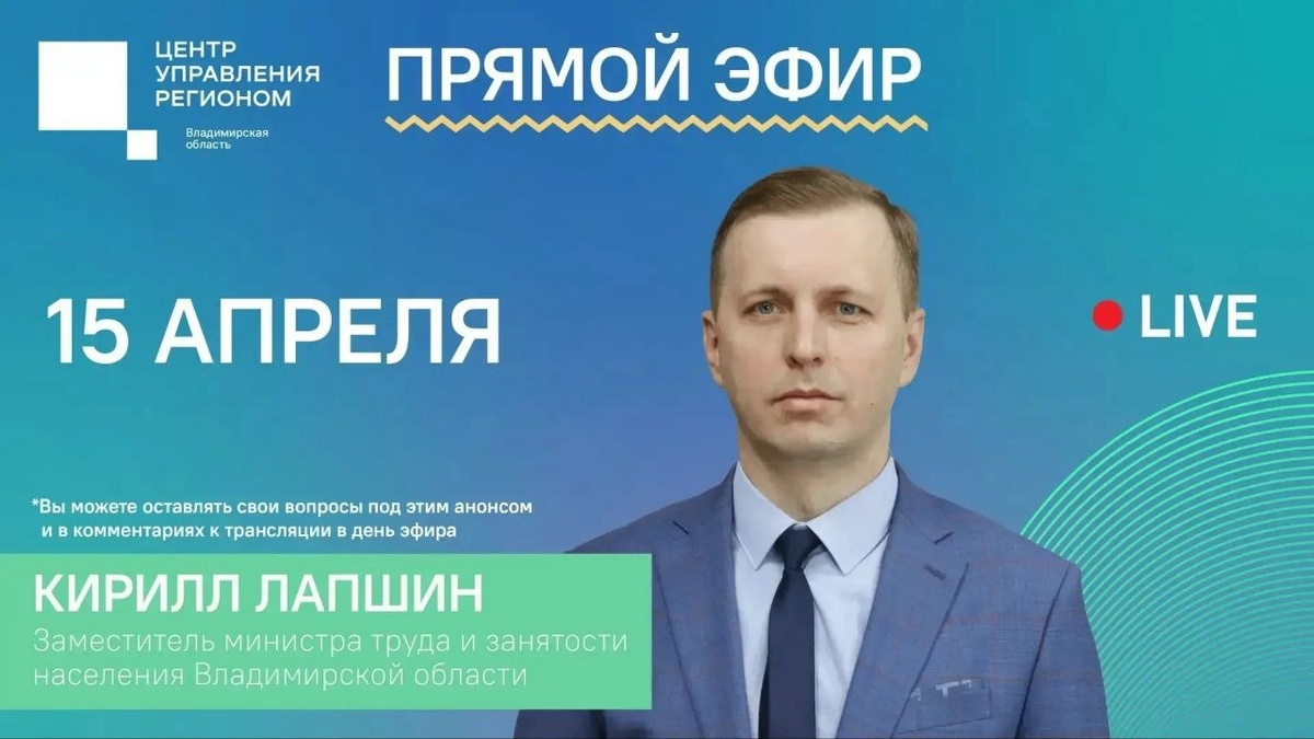 В эту среду, 15 апреля, гостем студии станет Кирилл Лапшин, заместитель министра труда и занятости населения Владимирской области