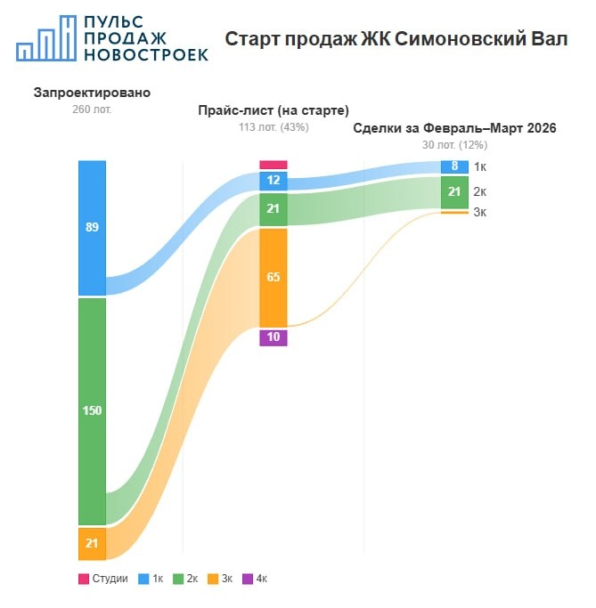 🏙 Проект квартир бизнес-класса от ГК ФСК на Новоостаповской улице в Южнопортовом районе Юго-восточного округа. До метро Дубровка 7 минут пешком, площадка в границах ТТК. Стартовый корпус Flow — 27-этажный дом, ввод во II квартале 2030, ключи обещают до 31.12.2030. Старт продаж — февраль 2026. 1️⃣Сделки За февраль–март 2026 в проекте прошла 31 сделка (Росреестр). Продано 12% от 260 запроектированных квартир и 65% от прайса на старте. Темп — 15,5 сделок в месяц. При таком ритме запасов хватит примерно на 15 месяцев. Спрос сосредоточен в двухкомнатных квартирах: 22 сделки из 31, средний бюджет покупки 31,4 млн ₽ — близко к средней цене 2к в прайсе. На однушки пришлось 8 сделок со средним бюджетом 22,2 млн ₽, это на -15% ниже средней цены 1к в прайсе — покупатели выбирали самые доступные лоты. Трёхкомнатную квартиру купили всего одну, бюджет 47,8 млн ₽. 2️⃣Структура предложения на старте и сейчас Застройщик вывел 113 лотов — 43% от запроектированного объёма. На старте доминировали т