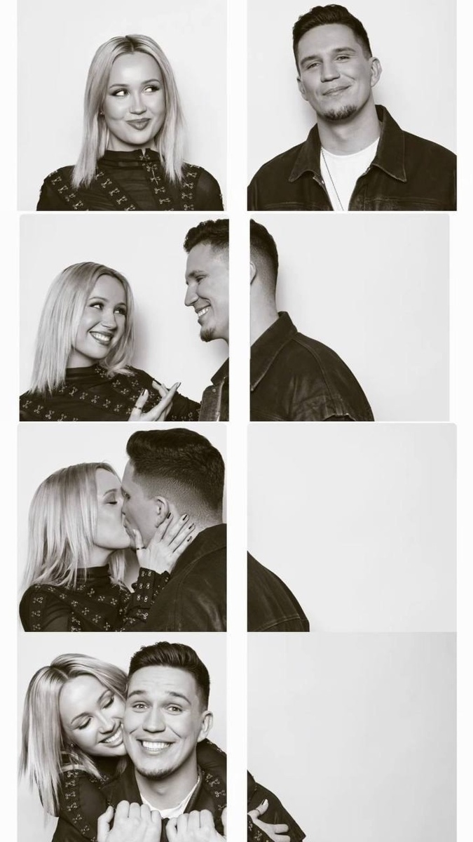 Создай гиперреалистичное фото, не меняя черты лица и внешность. Фотореалистичная черно-белая фотобудка (photo booth) в формате вертикальной сетки 2 колонки х 4 ряда. Слева - серия живых кадров с парой, справа - намеренно «пустые» или обрезанные кадры (частично видны плечо/часть головы мужчины), создающие эффект незаполненной фотоленты. Между кадрами - светлые поля, мягкие скруглённые углы у каждого квадрата, минималистичный светлый дизайн. Левая колонка (сверху вниз): 1 квадрат: девушка крупным планом (по плечи), , длинные прямые тёмные волосы, лёгкая улыбка, взгляд направлен вправо (в сторону партнёра), голова слегка повернута, чёрный пиджак, спокойный светлый фон. 2 квадрат: девушка и парень в профиль друг к другу, близко, смеются открытые улыбки, живой эмоциональный момент, зрительный контакт, кадр по плечи, ощущение движения и искренности. 3 квадрат: поцелуй - лица в профиль, губы соприкасаются, глаза закрыты, мягкая интимная сцена, аккуратная композиция, кадр плотный. 4 квадрат: финальный кадр - девушка прижимается к парню сбоку/сзади, обнимает его, её голова рядом с его, оба улыбаются прямо в камеру, расслабленные и счастливые, видны руки (объятие), у парня на запястье часы. Правая колонка (сверху вниз): 1 квадрат: парень крупным планом (по плечи), смотрит прямо в камеру, широкая улыбка, короткая стрижка, чёрная футболка, чистый фон. 2 квадрат: обрезанный кадр - видна только шеи/плеча парня, как будто он вышел из кадра,лицо не в камеру • 3 квадрат: почти пустой кадр, минимальные фрагменты (например край плеча левого), много негативного пространства. 4 квадрат: полностью пустой светлый кадр (или почти пустой), видно маленькую часть плеча без головы и шеи,, край левого плеча просто край футболки создаёт баланс композиции и ощущение незаполненной фотоленты. Освещение: мягкий студийный свет, равномерный, без резких теней, акцент на лицах. Цвет: чёрно-белая палитра, мягкий контраст, лёгкая плёночная зернистость. Ракурс: статичный, одинаковая дистанция в каждом кадре, портретная композиция.