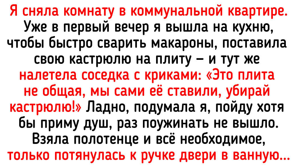 Я сняла комнату в коммунальной квартире. Уже в первый вечер я вышла на кухню, чтобы быстро сварить макароны, поставила свою кастрюлю на плиту — и тут же налетела соседка с криками: «Это не общая плита, мы сами её ставили, убирай кастрюлю!» Ладно, подумала я, пойду хотя бы приму душ, раз поужинать не вышло. Взяла полотенце и всё необходимое, потянулась к ручке двери в ванную... и снова появилась соседка: «Ванну и смесители меняли мы! В раковине умываться можешь, но ванная — не для тебя». Я окончательно вышла из себя и позвонила хозяйке. Та ответила: «Ну да, денег на замену плиты и ванны я им не давала. Договорись сама, вы же взрослые люди! Чего ты как ребёнок, я не собираюсь улаживать твои отношения с соседями». В общем, я съехала в экстренном порядке. © Anastomus / ADME