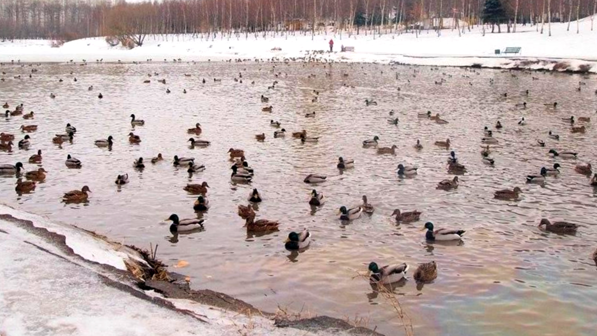 На реке появилась стайка уток. Они плавали близ берега, а некоторые птицы выходили на тонкий лёд и неспешно прогуливались по нему, похлопывая крыльями. Они выглядели так, будто приглашали поиграть — Ральф явно воспринял их активность за зов приключений и навострил уши.