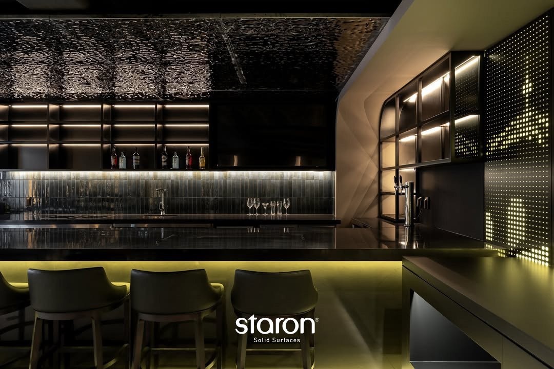 Проектирование отелей и баров всегда ставит перед дизайнером сложную задачу. Необходимо создать уникальную атмосферу, гарантируя при этом, что интерьер выдержит интенсивный поток посетителей и агрессивную эксплуатацию. В этом контексте акриловый камень Staron стирает границы между художественным замыслом и инженерной надежностью. Главное преимущество Staron для коммерческих объектов заключается в его монолитности. Технология бесшовного монтажа позволяет создавать конструкции любого масштаба без видимых стыков. Отсутствие швов решает сразу две проблемы. Во-первых, это эстетическая чистота и визуальная целостность формы. Во-вторых, гигиена. В стыках традиционных материалов часто скапливается грязь и влага, что недопустимо в общепите. Акриловый камень обладает непористой структурой, поэтому он не впитывает влагу, жир, красители от вина или кофе. На такой поверхности не размножаются бактерии и плесень, что подтверждено международными сертификатами безопасности, включая GREENGUARD. Для диз