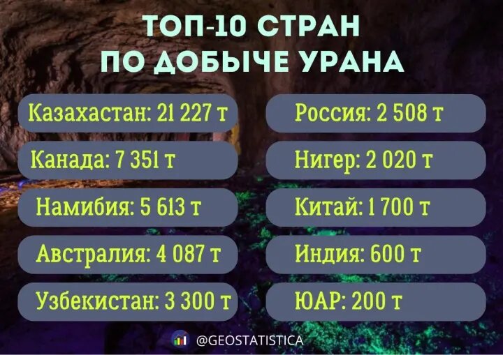 Telegram-канал "Геостатистика" сообщил, что сразу три государства СНГ вошли в десятку крупнейших стран мира по объёму добычи урана по итогам года.
