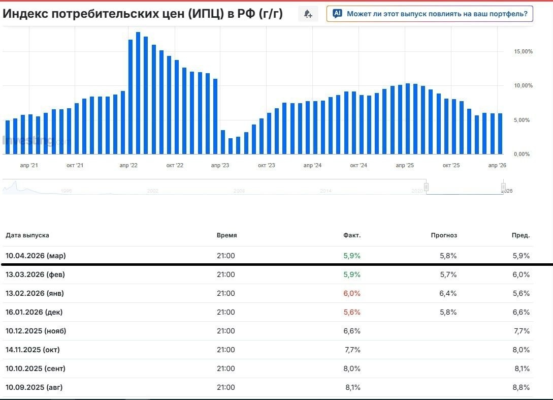 📊 Тут в понедельник вышли свежие данные по инфляции за март — давайте коротко и по делу разберём цифры. 📌 Индекс потребительских цен м/м (март): прогноз — 0,5% факт — 0,6% предыдущее значение — 0,7% 📌 Индекс потребительских цен г/г (март): прогноз — 5,8% факт — 5,9% предыдущее значение — 5,9% ⚖️ Если смотреть в динамике, инфляция вроде бы начинает замедляться, но не так быстро, как хотелось бы. Плюс не забываем про сезонность — весной цифры часто выглядят чуть лучше. 🌍 Отдельный риск сейчас — внешний фон. Конфликт на Ближнем Востоке может давить на цены дальше, а это уже фактор, который ЦБ точно будет учитывать. 🤔 Мой взгляд на ситуацию сейчас такой: снижение ставки, скорее всего, продолжится, но очень аккуратно. Базовый сценарий — шаги по 0,5%. ⚠️ Но важно понимать: даже снижение на 0,5% особо картину не меняет. Ставка всё равно остаётся высокой, а если инфляция начнёт снова ускоряться, ЦБ может пересмотреть свои ожидания. 📉 А это уже потенциально негативно для рынков. �