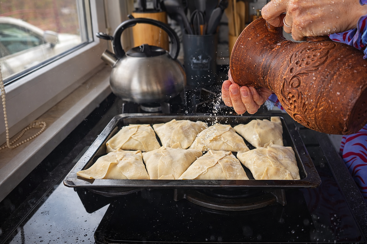 Это древний способ, так как мы не будем смазывать самсу яйцом. Сбрызгиваем водой — благодаря этому самса получится румяной сверху.