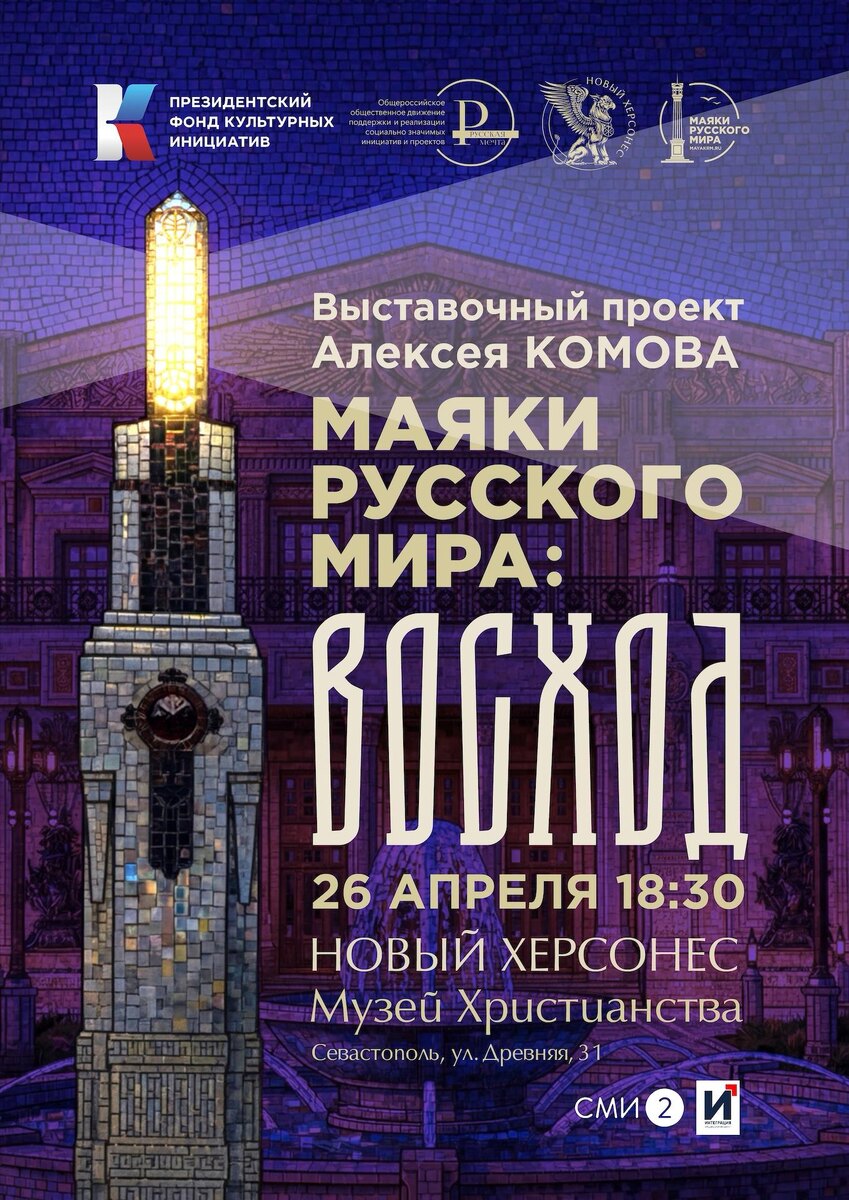 Важнейшим мероприятием Форума-концерта «Ангел Херсонеса» станет выставочный проект «Маяки Русского Мира: Восход» архитектора Алексея Комова, который будет экспонироваться в актовом зале Музея Христианства музейно-храмового комплекса «Новый Херсонес». На выставке покажут проекты и макеты маяков-монументов, тематическую галерею живописи Алексея Комова и масштабное панно «Восход» художника Алексея Гинтовта. Архитектурный проект «Маяки Русского мира» — это инициатива по объединению и возрождению культурного пространства Новороссии и новых регионов России через символические архитектурные объекты-маяки. Впервые он был представлен в 2023 году на XXXI фестивале «Зодчество» в Москве, где ведущие российские архитекторы-патриоты под руководством основателей проекта Алексея Комова и Юрия Белоусова создали концепции маяков-памятных знаков для городов Новороссии, Донбасса, Крыма и др. «Маяки Русского мира» — не просто арт-объекты, а носители исторической и культурной преемственности, призванные