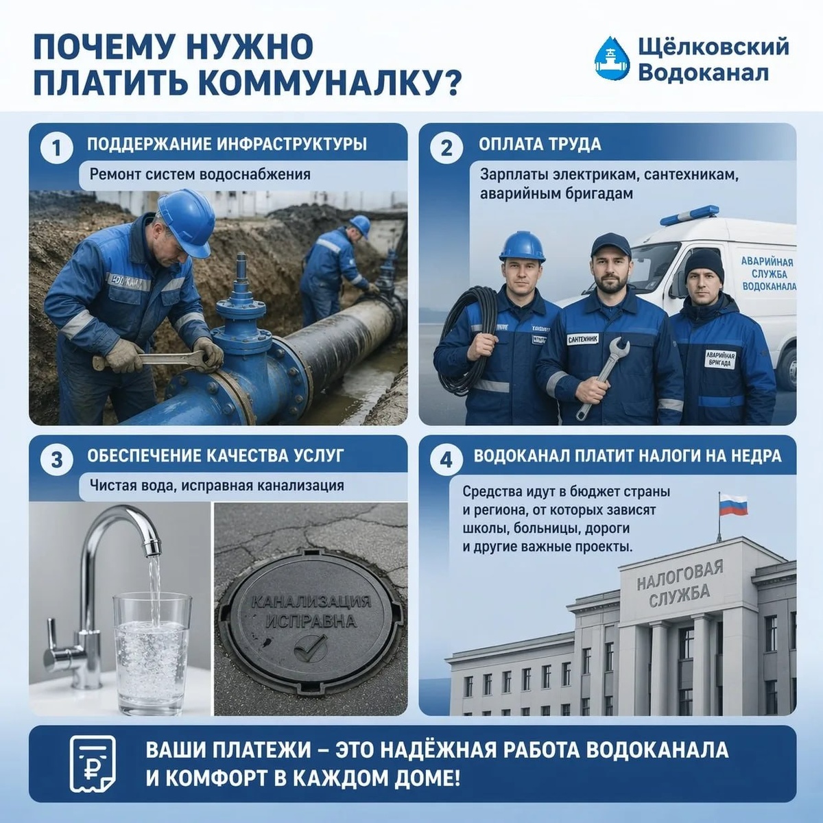 Поддержание инфраструктуры: Оплата коммунальных услуг обеспечивает работу и ремонт систем водоснабжения, отопления, электричества, канализации и газоснабжения, без которых невозможно комфортное проживание. Оплата труда: Деньги идут на зарплаты работникам, обслуживающим эти системы: электрикам, сантехникам, аварийным бригадам, диспетчерам и так далее. Обеспечение качества услуг: Коммунальные платежи финансируют закупку необходимых материалов, оборудования и технологий для бесперебойной и качественной поставки воды, тепла, света и газа. Социальная ответственность: Своевременная оплата коммунальных услуг является проявлением заботы об общем благе, так как позволяет поддерживать жизнеобеспечение всего дома/улицы/округа и не создавать проблем для соседей. 🌐 сайт | Мах | ВКонтакте | Одноклассники | Ютуб | Рутуб | Yappi