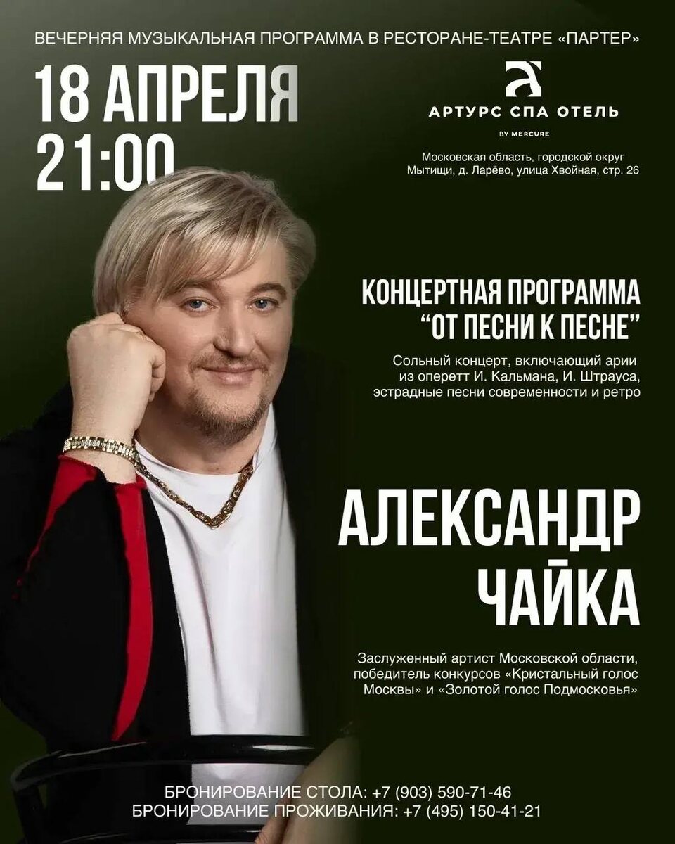 области, победителя конкурсов «Кристальный голос Москвы» и «Золотой голос Подмосковья» - Александра Чайки. Концертная программа "От песни к песне" состоится 18 апреля в 21:00 в Ресторане-театре "Партер". Специальное предложение на размещение -20% на все категории номеров. Бронирование столов: +7(903)590-71-46 Бронирование проживания по телефону: +7(495)150-41-21 или онлайн на сайте: accor.ru/booking/?hotel_id=3862