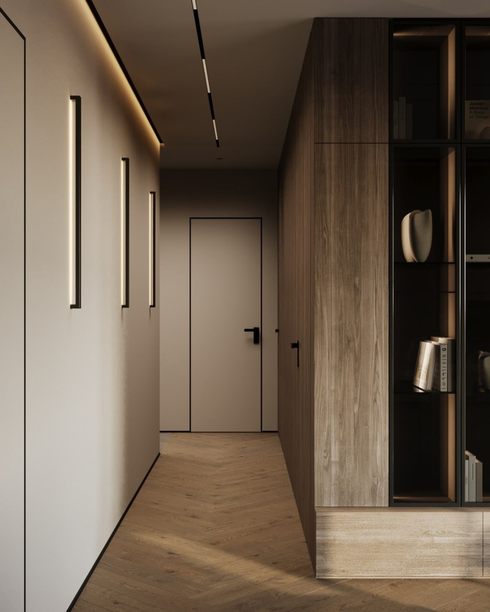 Вводные: Компактная прихожая с функцией переодевания и быстрой бытовой логистики. Задача — сделать чистое, цельное пространство без визуального шума. Риски: - Маленькое пространство → риск перегруза - Много дверей и шкафов → эффект «коробки» - Тёмные материалы → могли съесть объём - Зона входа → всегда самая нагруженная визуально Что сделали? - Выстроили единый объём хранения вдоль стены - Убрали ручки — фасады работают как плоскость - Добавили нишу с консолью и зеркалом - Ввели декоративную стену с фактурой «скалы» - Развели сценарии света: трек, бра, скрытая подсветка Как решили проблемы? - Разделили материалы: светлая стена vs тёмный объём хранения → появился контраст и глубина - Вертикальные линии фасадов вытянули пространство - Подсветка «разорвала» плоскости — нет ощущения тесноты - Ниша с консолью дала точку фокуса у входа - Все элементы сведены в одну систему Материалы: Стены: моющаяся краска (NCS S 3005-Y50R / S 1505-Y60R) Пол (вход): керамогранит Atlas Concorde Boost Pe
