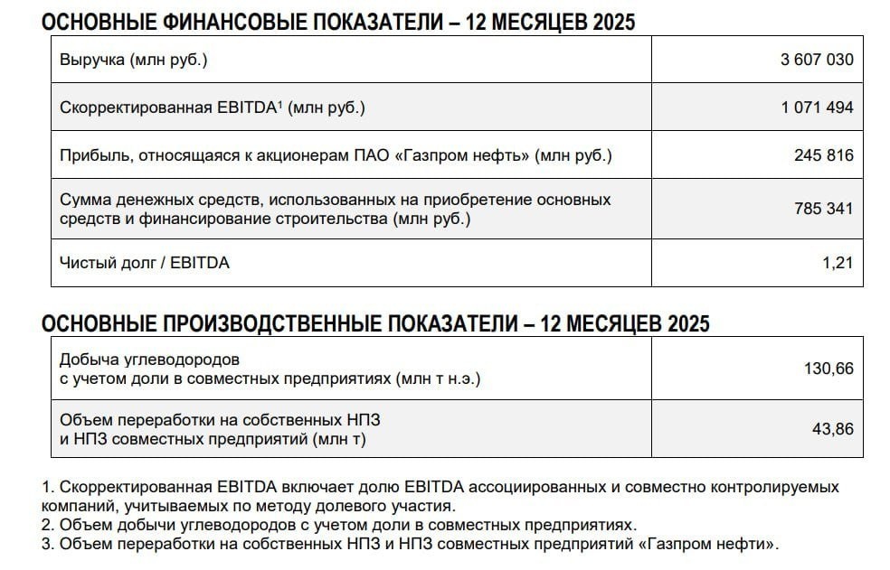 👉Капитализация: 2498 млрд / 527₽ за акцию ▪️Выручка 2025: 3,6 трлн ₽ (-12% г/г) ▪️EBITDA 2025: 1071 млрд ₽ (-23,3% г/г) ▪️Чистая прибыль 2025: 245,8 млрд ₽ (-48,7% г/г) ▪️скор. ЧП 2025: 207,3 млрд ₽ (-59,1% г/г) ▪️P/E: 12 ▪️P/B ТТМ:0,8 ▪️fwd дивиденды за 2025: 6,2% 👉2025й год для компании выдался ожидаемо слабым. Крепкий рубль и дешевая нефть дали о себе знать. С учетом корректировки на курсовые разницы, компания заработала 207,3 млрд р чистой прибыли и в сумме направит около 32,8 р на дивиденды (17,3р уже выплачены,, осталось примерно 15,5р). Доходность всего 6,2% к текущей цене акций. Качество отчетности не сильно лучше, чем у Роснефти, раскрытие минимальное и это усложняет точный расчет корректировок. Например, в отчете зафиксировалипрочих расходов на 70 млрд рублей, это вполне могли быть списания и обесценения, но деталей нет. 👉На конец 2025г, чистый долг Газпромнефти вырос до 1296 млрд рублей при ND/EBITDA = 1,2. Ещё в 2022г этот показатель не превышал и 200 млрд рублей, но