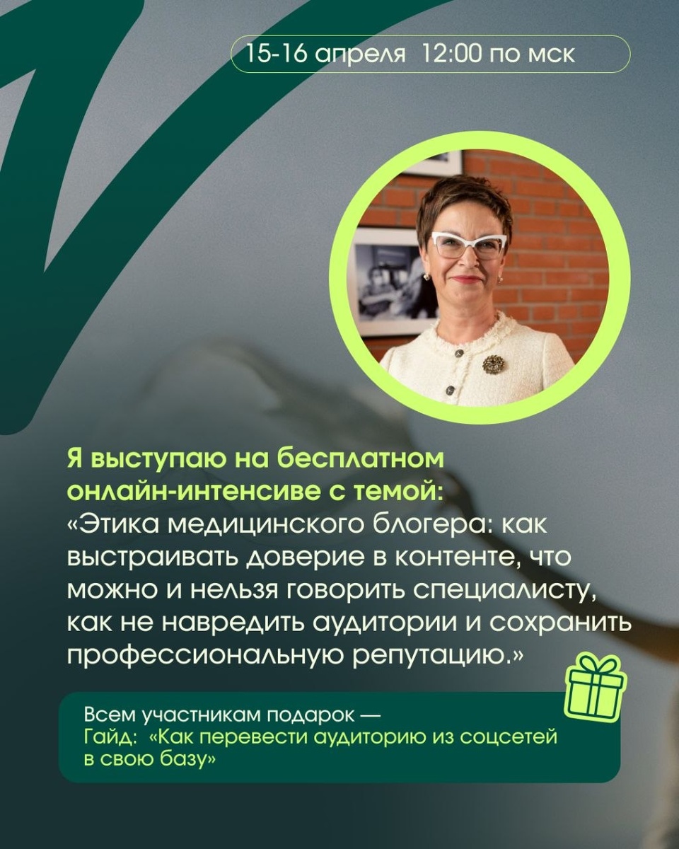: «Продвижение без блокировок: как врачу и нутрициологу не потерять клиентов и доход в новых реалиях» Я буду выступать с темой: Этика медицинского блогера: как выстраивать доверие в контенте, что можно и нельзя говорить специалисту, как не навредить аудитории и сохранить профессиональную репутацию. 📅 15–16 апреля 🕛 12:00 (онлайн) 🎟 Участие бесплатное После интенсива вы получите понимание, как системно работать с аудиторией, выстраивать коммуникацию и не терять клиентов. 🎁 Подарок за регистрацию: Гайд «Как перевести аудиторию из соцсетей в свою базу» 👉 Регистрация по ссылке https://vnais.ru/web_april?utm_source=tg&utm_medium=nais