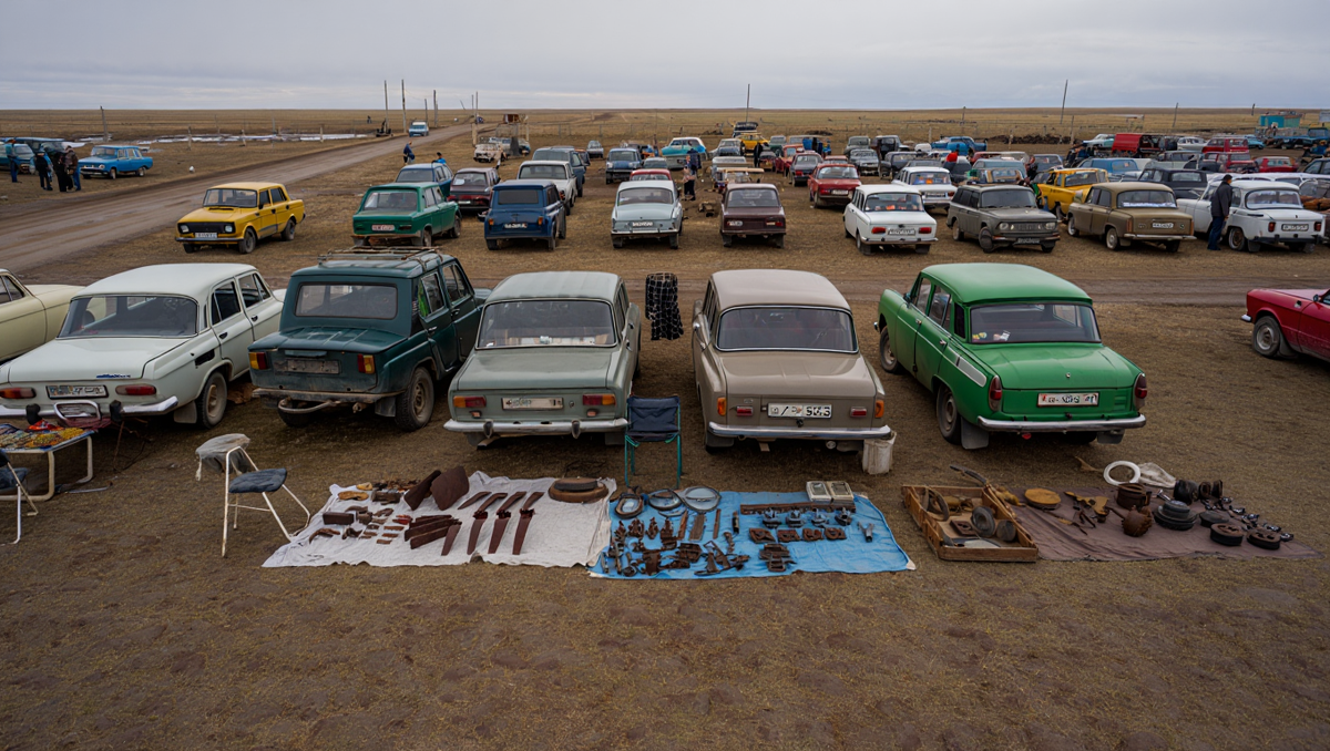 Базар в Аксуэйке оживал только по субботам. Совсем не так, как в Алма-Ате — с ровными рядами, навесами и бумажными ценниками. Здесь всё было проще, по-степному суровее. Три десятка машин, в беспорядке приткнувшихся вдоль пыльной дороги, тряпки с запчастями, расстеленные прямо на земле, старухи с баночками варенья, мужики с неизменными папиросами в зубах — они торговали чем угодно: от ржавых гвоздей до кроличьих шкурок. Серик приехал сюда за помпой для своего УАЗа.
