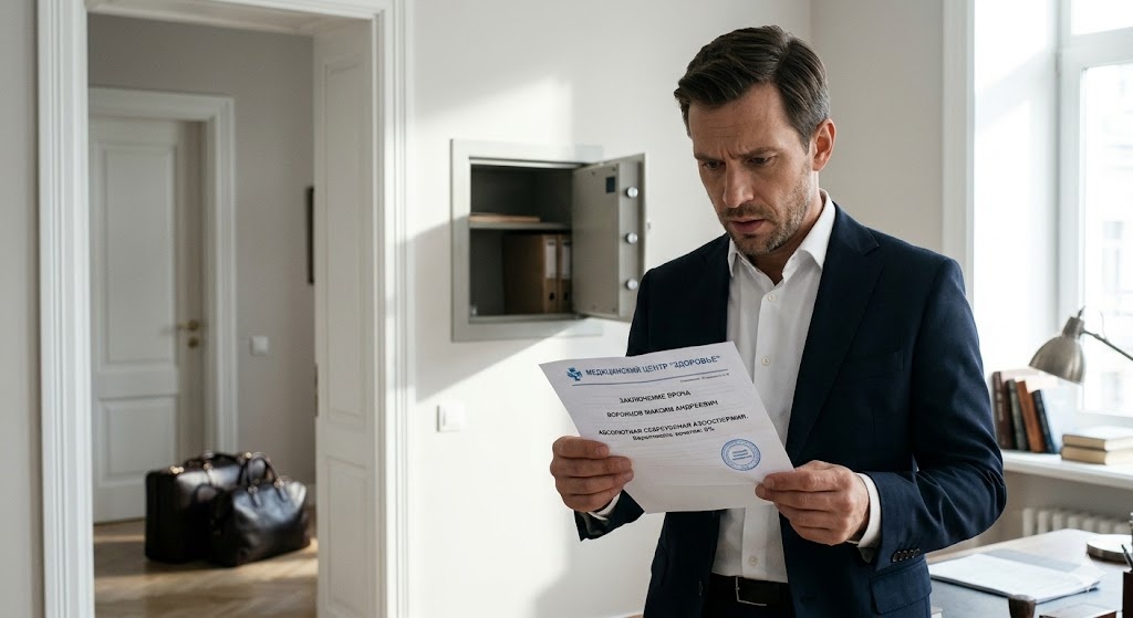 Рядом с документами лежал вскрытый пустой конверт из медицинского центра.