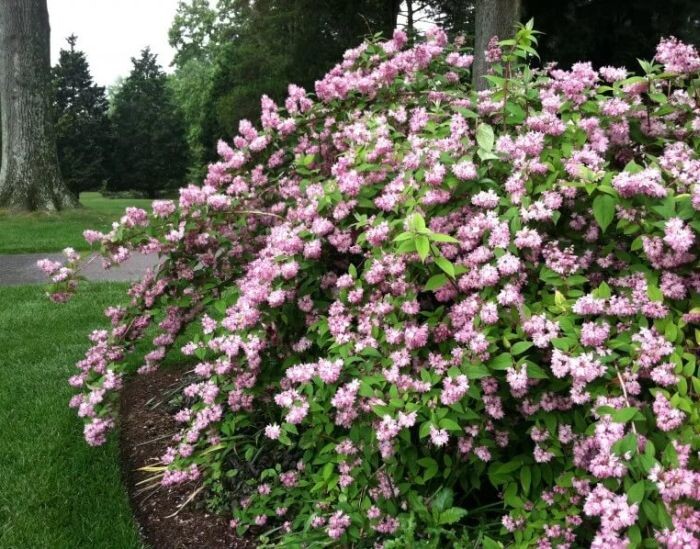 Дейция гибридная Калмиицветная (D. x kalmiiflora) - (1,5 м), цветы ярко-розовые снаружи, белые внутри. Напоминает цветы калмии. Зимостойка до -34°C (зона 4).