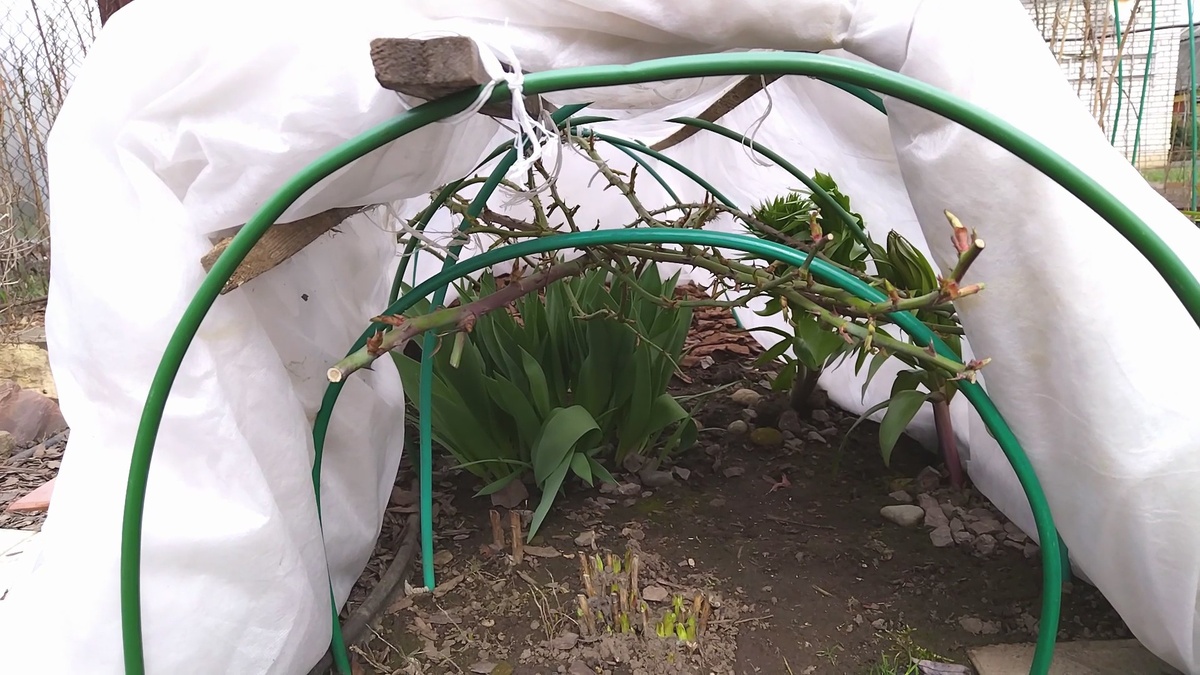 Как только растает снег, но погода еще неустойчивая: то тепло, то заморозки, то солнце, то ветер или дождь провожу постепенное раскрытие роз. В конце марта - начале апреля приоткрываю торцы укрытия при плюсовых температурах. Так розы проветриваются и на солнце не обгорают. А на случай ночных заморозков укрытие легко снова опустить.