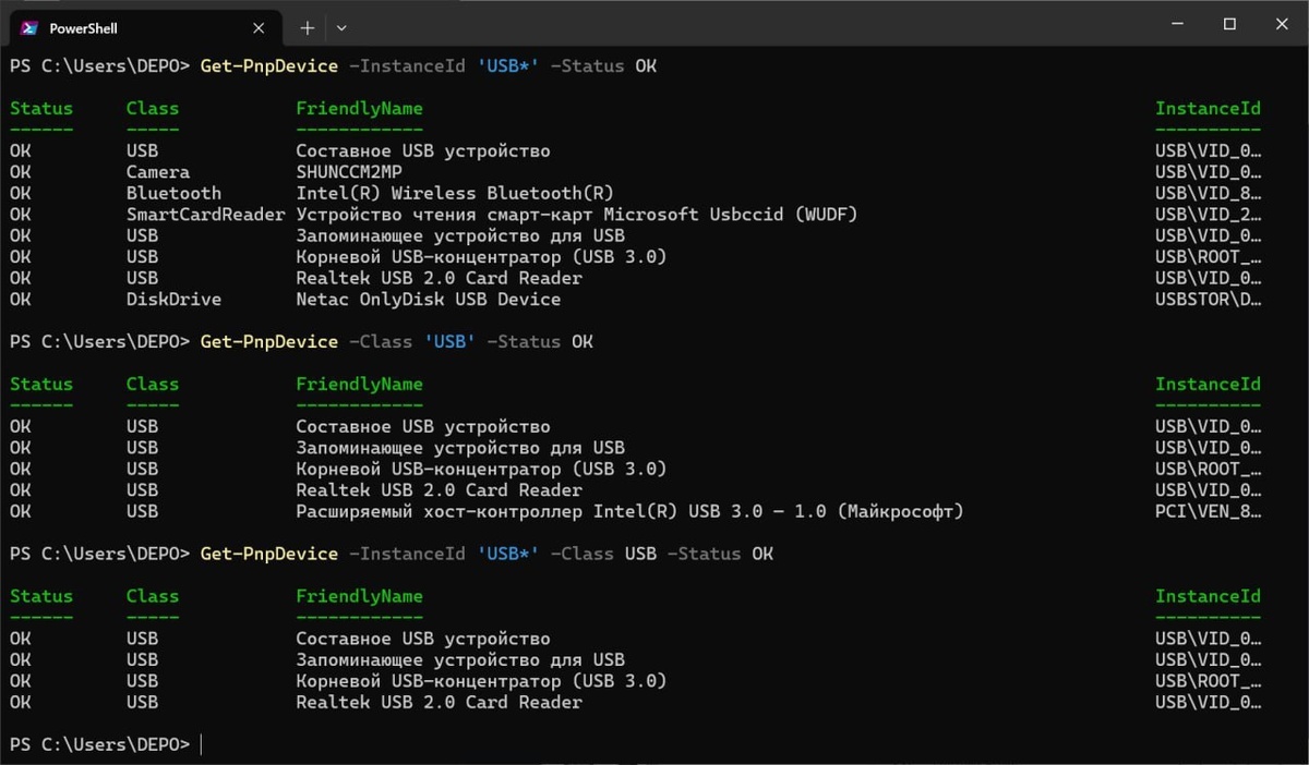 Возникла необходимость просмотреть список подключенных устройств на удаленном ПК с Windows. Задача не самая простая, ну не бегать же глазами по диспетчеру устройств. В Linux для этого есть команда lsusb, посмотрим, что может нам предложить PowerShell. Для этой цели будем использовать командлет Get-PnpDevice, для начала отберем устройства по идентификатору в котором присутствует USB, опция Status OK покажет только активные устройства: Get-PnpDevice -InstanceId 'USB*' -Status OK Кроме идентификатора мы можем использовать в отборе класс, но в этом случае в вывод не попадут такие устройства как камеры или смарт-карты (токены), но может попасть совсем не USB-устройство, например, контроллер USB на PCIe шине: Get-PnpDevice -Class 'USB' -Status OK При желании можем оба отбора скомбинировать и получить только устройства класса USB подключенные именно как USB: Get-PnpDevice -InstanceId 'USB*' -Class USB -Status OK Как видим, PowerShell дает не меньше возможностей и позволяет легко выполн