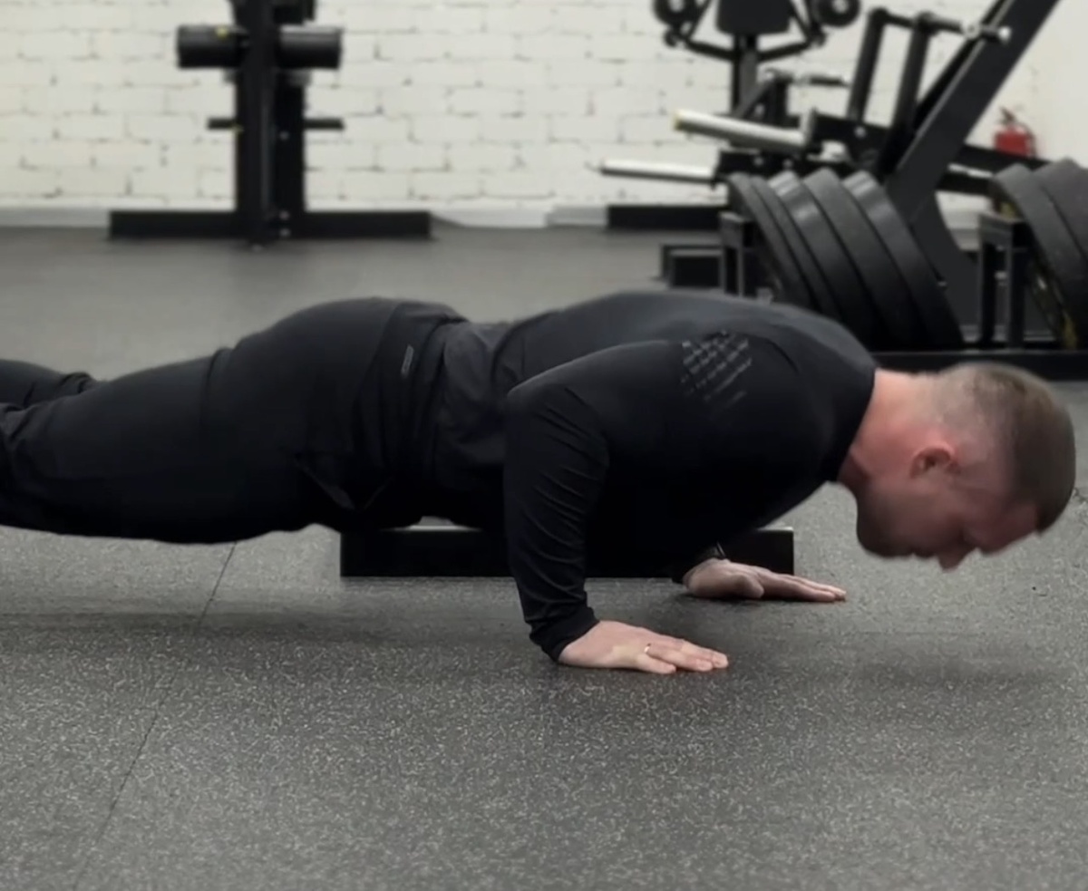 - Движение: Вниз — до касания грудью пола (или до угла в локтях 90 градусов). Вверх — до полного выпрямления рук.