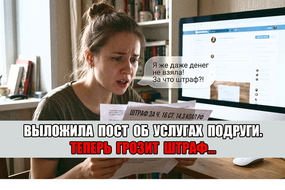 И вот за эти 300 рублей и бесплатную помощь подруге меня теперь оштрафуют на 30 тысяч минимум?! Я слышала о маркировке, но полагала, что меня это не касается. Мелкая городская группа с услугами, какая там реклама? Да тот пост едва тысячи две человек мельком в ленте увидело.