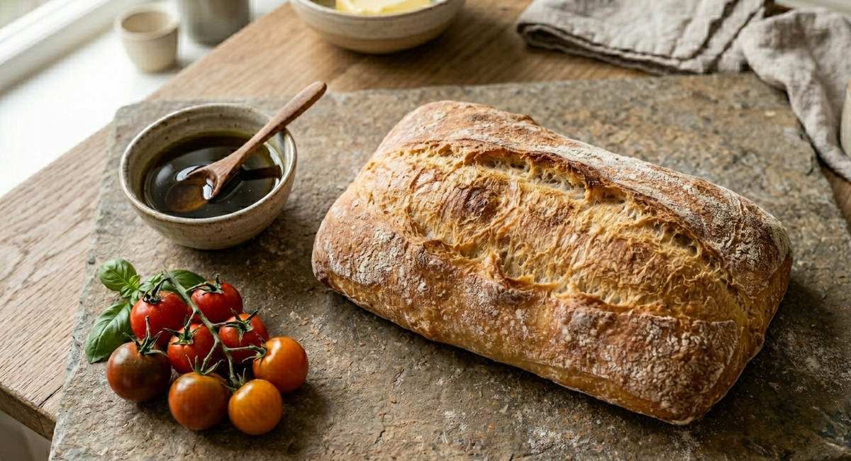 Чиабатту часто называют самой капризной. Она не любит суеты, торопливых рук и сухой муки. Зато если дать ей время и не бояться липкого теста, она отблагодарит мякишем с огромными, неправильной формы дырами, тонкой хрустящей корочкой и вкусом, от которого захочется печь снова и снова. Этот рецепт — для тех, кто готов ждать. В нём нет быстрых дрожжей в больших количествах, зато есть долгая опара и холодная расстойка. Результат стоит того. Обещаю. Смешайте 150 г муки, 150 г воды комнатной температуры и дрожжи. Перемешайте до однородности (тесто будет как густая сметана). Накройте плёнкой и оставьте при комнатной температуре (20–22°C) на 8–12 часов. Готовая опара — пузырчатая, с приятным кисловатым запахом, увеличившаяся в 2–3 раза. В миску с опарой добавьте 80 г воды, соль и оливковое масло (если используете). Перемешайте. Постепенно всыпьте 175 г муки. Замешивайте миксером с насадкой «крюк» 7–10 минут на низкой скорости. Тесто будет очень липким — это норма. Оно должно собираться вокруг