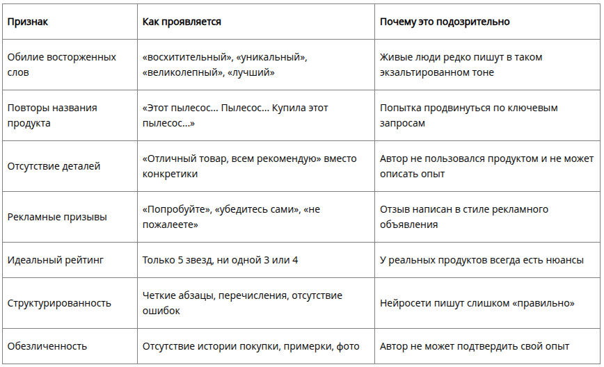 На основе анализа исследований и экспертных мнений, выделяют ключевые признаки, по которым нейросети (и внимательный читатель) могут отличить фейк от настоящего отзыва.