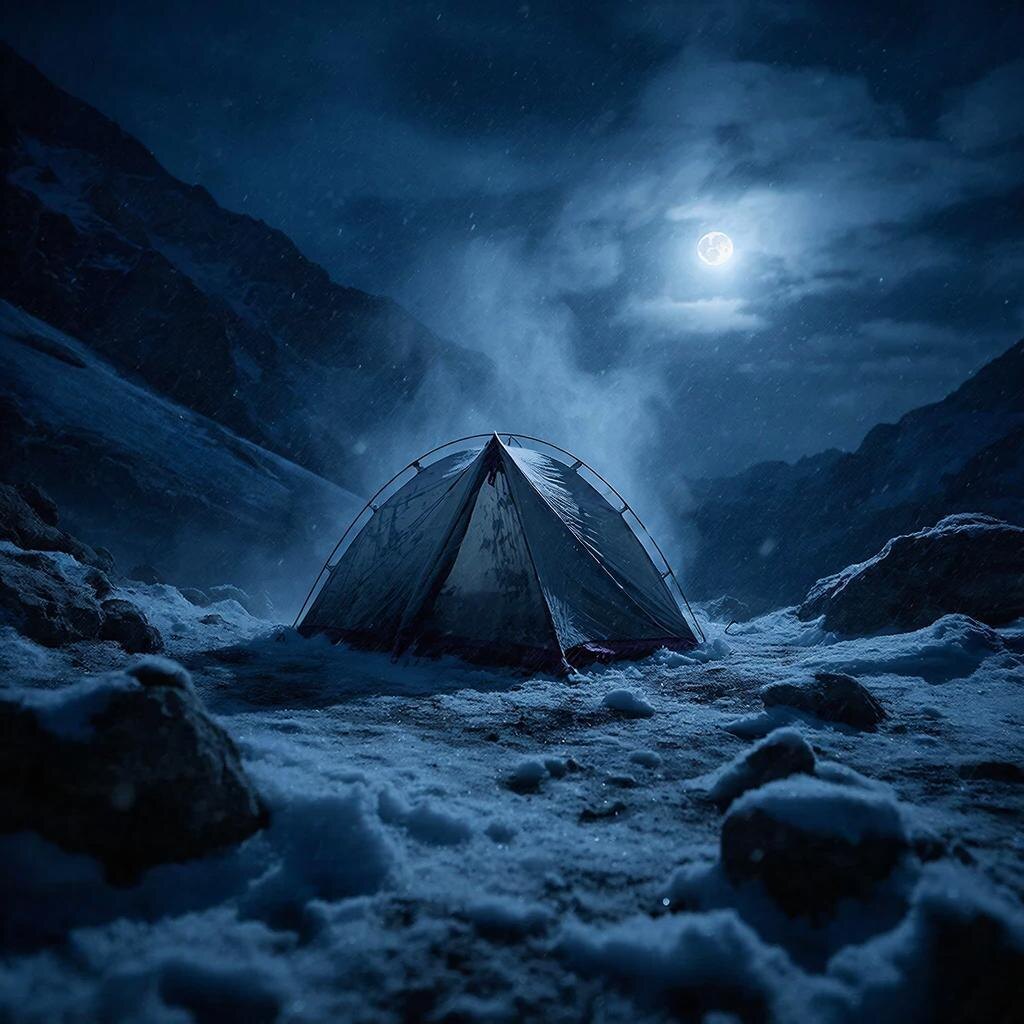 — А потом пошёл снег. Но не обычный пушистый или колючий. Это была ледяная крупа. Мелкая-мелкая, твёрдая как дробь. И она не падала сверху... Она летела будто волнами горизонтально. Обтекала нашу палатку со всех сторон: то слева направо, то справа налево, словно невидимая река из льда текла сквозь нас. Шорох этих льдинок о тент постоянно смещался из стороны в сторону. И при этом — ни дуновения ветра! Ни единого звука! Только этот тихий, зловещий шелест летящих льдинок по ткани палатки. Мы с Мишкой лежим в спальниках, свет выключили для экономии батареек. Темно хоть глаз выколи.