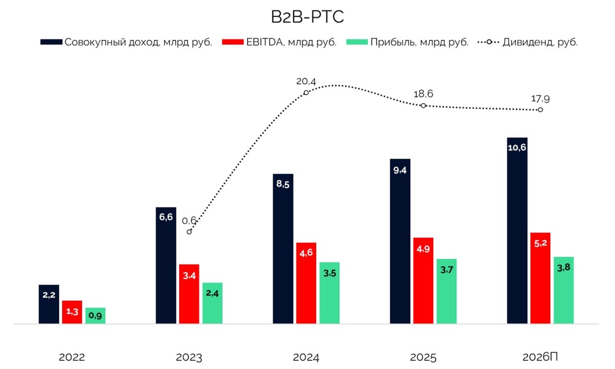 ». Это крупнейшая в России по количеству торговых процедур электронная торговая платформа (ЭТП) для бизнеса и государства. В компанию входят РТС-Тендер – электронная площадка для проведения регулируемых закупок, В2В Center – электронная площадка для проведения коммерческих закупок, РТС-Академия – образовательный центр, лаборатория цифровых разработок ОТС и цифровой сервис «Облачная логистика». Бизнес В2В-РТС чем-то похож на классифайд (HEAD, CNRU), чем-то на маркетплейс (OZON), а где-то и на известные российскому инвестору биржи (MOEX, SPBE): компания получает доход от комиссий за транзакции, доход включает также лицензионные и подписочные модели, а также доход от управления активами: клиентские остатки, оставляемые участниками торгов в качестве обеспечения, В2В-РТС размещает в финансовых инструментах (высоконадежные облигации и депозиты). Финансовые результаты Компания показывает стабильный рост, правда, по итогам 2025 года темп совокупного дохода замедлился до 10%, до 9,4 млрд руб