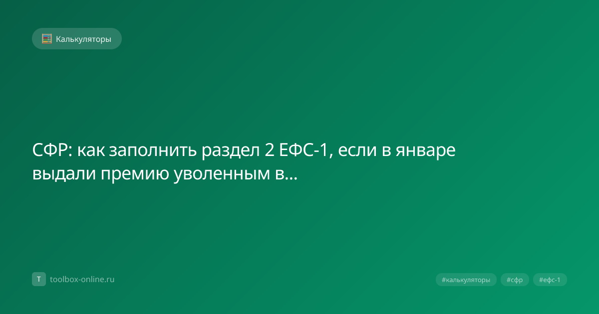 Чтобы правильно указать премию, выплаченную в январе 2026 года уволенному в 2025 году, в разделе 2 формы ЕФС‑1, необходимо занести её в графу «Выплаты при увольнении», указать точную дату и сумму, а также подтвердить запись подписью ответственного за расчёт. Ответ: В графе «Выплаты при увольнении» укажите дату выплаты (01.01.2026) и сумму премии в рублях, например «150 000 руб». Далее отметьте код «П» (премия) в колонке «Код выплаты». Детали: Ответ: Дата выплаты определяет налоговый период, в котором начисляются подоходный налог и страховые взносы, а также влияет на расчёт пособий по безработице. Детали: Ответ: Если премия ошибочно отражена в листе за 2025 год, необходимо оформить корректирующий расчётный лист и внести исправления в ЕФС‑1. Детали: Ответ: Налоговый удержание составляет 13 % от суммы премии, а страховые взносы – 2,9 % (вклад в ФСС) плюс 0,2 % в фонд обязательного медицинского страхования. Пример расчёта для суммы 150 000 руб: Ответ: Код «П» позволяет автоматизировать кла