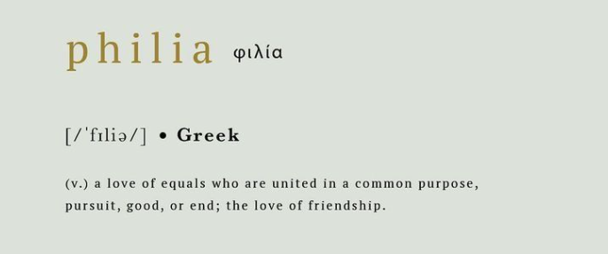 Фили́я (др.-греч. φιλία) — древнегреческое слово «филия», часто переводимое как «дружба» или «любовь», не имеет точного соответствия в других языках. Оно обозначает не только «дружбу», но и «дружественность», «расположение», «притяжение», «влечение», «любовь». Существительное «филия» имеет в греческом однокоренной глагол — др.-греч. φιλέω — «дружу — люблю». (wikipedia.org) В английской версии этой статьи в определении так же указывается, что филия часто переводится как «братская любовь», а абсолютной противоположностью филии является фобия.