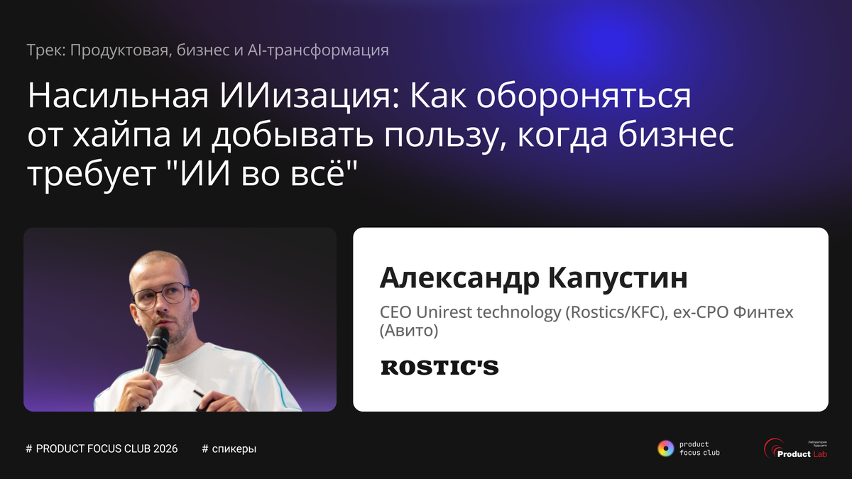 За последний год запрос “где у нас AI?” стал почти стандартным. И чаще всего он идет не из продукта, а сверху, как реакция на рынок и хайп. Сценарий предсказуемый: AI появляется в продукте ради галочки и не добавляет никакой ценности пользователю. На Product Focus Club разберем, как с этим работать на практике — и в каких случаях внедрение искусственного интеллекта в продукт реально несет практическую пользу. Александр Капустин, СЕО Unirest technology (Rostics/KFC), ex-СРО Финтех (Авито), поделится опытом, что делать в ситуации, знакомой многим продуктовым командам. — как справлялись с запросом «сделайте AI везде»; — какие кейсы реально сработали: computer vision, автоматизация, поддержка; — что не получилось и почему; — как сейчас подходим к внедрению AI без иллюзий. До конференции осталось 8 дней! ❤️ Присоединиться к Product Focus Club