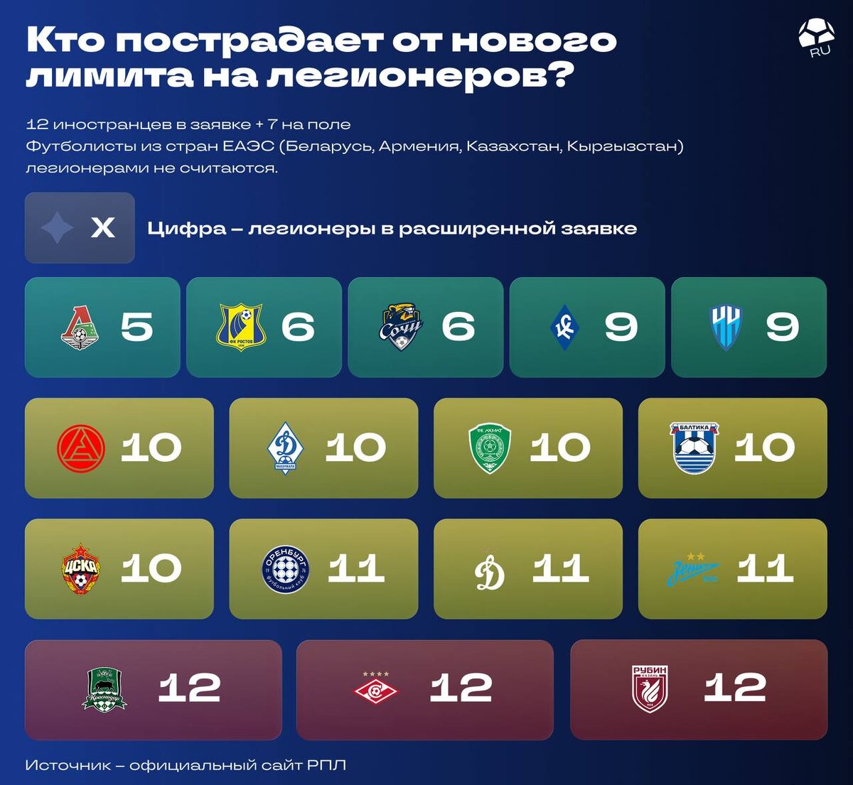 «Краснодар», «Спартак» и «Рубин» с огромным трудом вписались бы в новый лимит. «Локомотив» чувствовал бы себя комфортно при любых ограничениях, а «Зенит», который больше всех боролся с лимитом, с запасом в одного иностранца (как и «Динамо») влезает в 12+7 со следующего игрового года. Но если в сезоне-2028/29 действительно дойдет до формата 10+5, то продавать легионеров придется почти всем топ-клубам. Хуже всего ситуация у «Краснодара», «Спартака» и «Рубина» – по 12 иностранцев. Однако пока что с трудом верится, что лимит на самом деле доживет до 10+5. Минспорт хотел осуществить эти изменения уже со следующего сезона, но у ведомства не получилось. @myach | МЯЧ RU в МАХ