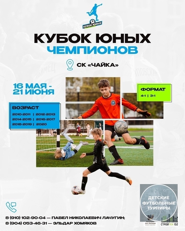 Приглашаем вас на турнир [https://vk.ru/footballchampion_nn|«Кубок Юных Чемпионов»], который состоится на территории СК «Чайка»! 🔥 🗓 Игровые дни: 16 мая - 21 июня, сб и вс 👉🏻 Возраст: 2010-2019 года (4+1), 2020 год (3+1) 📍 Локация: Нижний Новгород, ул. Школьная, 32А Что вас ждет: – профессиональные фото- и видеосъемка; – аккредитованный судейский корпус; – призы и подарки от организаторов и партнеров; ❗Подать заявку: vk.cc/cUOYvi Контакты: – 8 (910) 102-90-04, Павел Николаевич Лачугин; – 8 (904) 053-46-31 (telegram, МАХ) — Эльдар Хомяков -— #ФутбольныйТурнирМай2026 #ФутбольныйТурнирЦентральнаяРоссия2026 #ФутбольныйТурнирНижнийНовгород2026 #ФутбольныйТурнирНижнийНовгород2010гр #ФутбольныйТурнирНижнийНовгород2011гр #ФутбольныйТурнирНижнийНовгород2012гр #ФутбольныйТурнирНижнийНовгород2013гр #ФутбольныйТурнирНижнийНовгород2014гр #ФутбольныйТурнирНижнийНовгород2015гр #ФутбольныйТурнирНижнийНовгород2016гр #ФутбольныйТурнирНижнийНовгород2017гр #ФутбольныйТурнирНижнийНовгород2018гр #