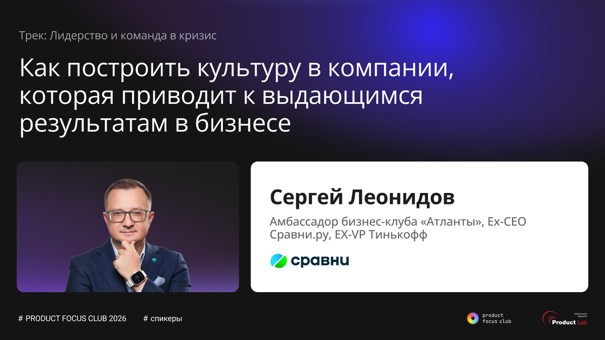 Многие компании упираются в потолок и пытаются решить это наймом, процессами или контролем. Но результат не меняется. Сильные люди не раскрываются. Решения принимаются медленно. Ответственность размывается. И в какой-то момент становится очевидно: культура либо ускоряет бизнес, либо незаметно его тормозит 17 апреля Сергей Леонидов, Амбассадор бизнес-клуба «Атланты», Ex-CEO Сравни.ру, EX-VP Тинькофф, выступит на Product Focus Club 2026 и разберет, как выстраивать культуру, которая действительно приводит к результатам — ТОП-5 ключевых проблем в корпоративной культуре, которые мешают росту