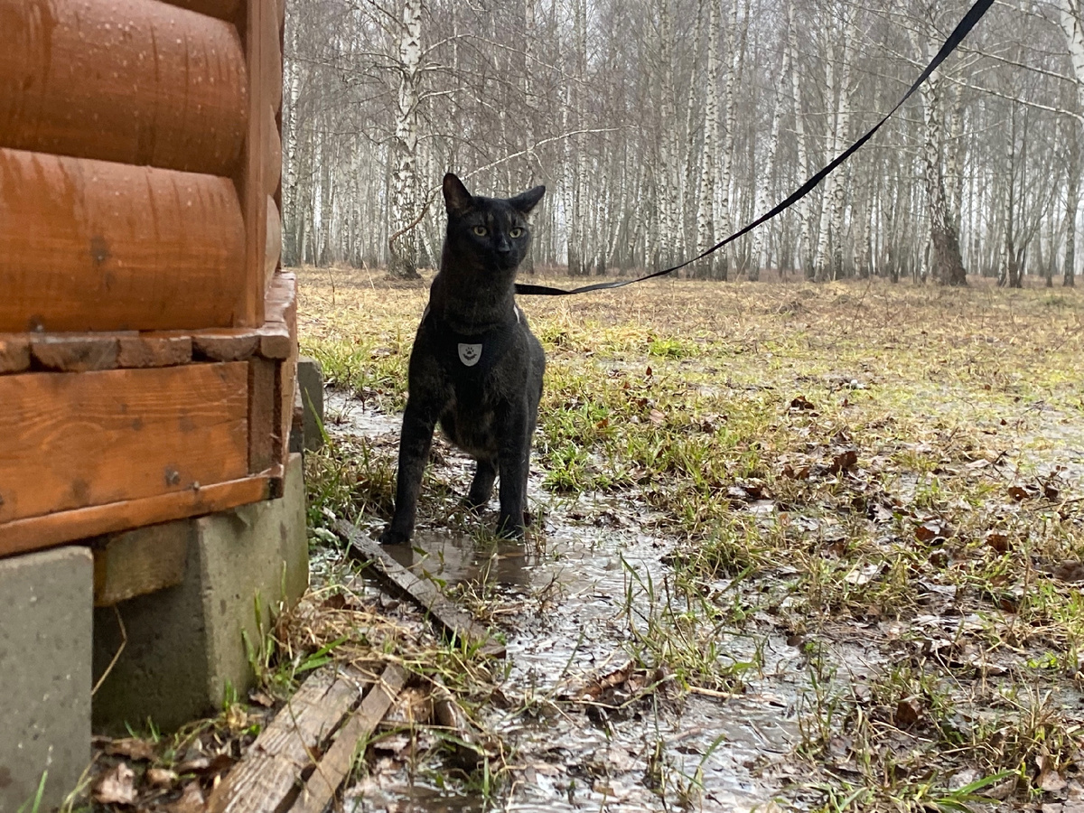 - Я с удовольствием! – с энтузиазмом ответила я. И мы тут же облачили очень радующегося, но явно не подозревающего, что его ждет, Лимона в шлейку и пошли одеваться во что-то непромокаемое сами. Кот просто выбежал на улицу. Только вот мы-то были готовы к тому, что там происходит, а он – нет. Стремительно преодолев пару метров от порога, Лимон остановился. Замер. Задумался. Огляделся. Я стояла в капюшоне и с улыбкой наблюдала, как медленно, но верно кот осознает, что его ожидания разошлись с реальностью да и вообще эта реальность сейчас какая-то странная. Но Лимон был бы слишком прос